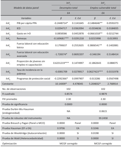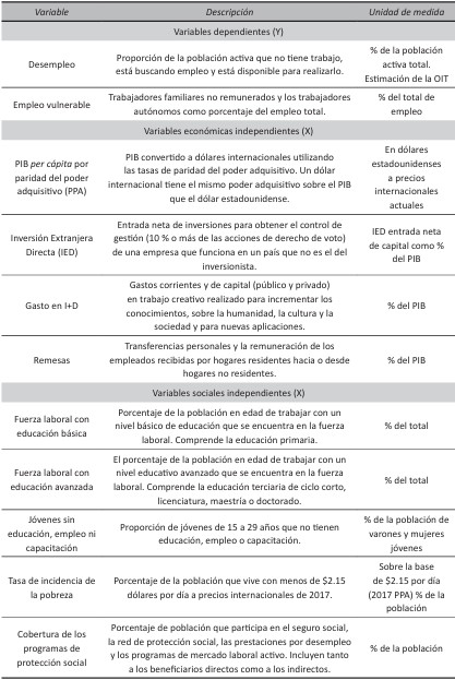 En los datos panel una misma variable se extiende transversalmente y a lo largo del tiempo, por lo que se tienen dos dimensiones; una espacial (i) de individuos, y otra temporal (t) (Gujarati, 2003). El principal objetivo de los modelos de datos panel es capturar la heterogeneidad no observable, que pudiera afectar la estimación de los efectos de las variables X sobre Y (Perazzi y Merli, 2013). Al implicar dos dimensiones de los datos panel se deben abordar los problemas específicos de cada una, el corte transversal genera heterocedasticidad y la dimensión temporal puede desencadenar autocorrelación. Además de la correlación cruzada para las unidades individuales en un mismo momento del tiempo. Estas situaciones pueden resol- verse mediante algunas técnicas de estimación como los modelos de efectos fijos o los de efectos aleatorios (Gujarati y Porter, 2010; Wooldridge, 2010). En la tabla 2 se muestran las variables dependientes del estudio, éstas son el desempleo y el empleo vulnerable. Las variables independientes se subdividen en económicas: PIB per cápita PPA, IED, el gasto en I+D y las remesas. Las variables sociales son la fuerza laboral que cuenta con educación básica y educación avanzada, los jóvenes de entre 15 a 29 años que no estudian, no trabajan y no tienen capacitación, la tasa de incidencia en la pobreza, y la cobertura de los programas de protección social. El procesamiento de la información se realizó en el programa STATA.