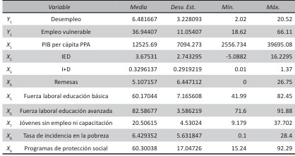 En la tabla 3 se presenta la estadística descriptiva, en América Latina de 2000 a 2023. En la región hay una media de desempleo de 6.4 % con un mínimo de 2.02 % y un máximo de 20.52 %. El empleo vulnerable ha tenido un promedio de 36.94 % con un mínimo de 18.62 % y un máximo de 66.11 %. El PIB per cápita PPA tiene una media de 12 mil 526 USD, con un mínimo de 2 mil 557 y un máximo de 39 mil 695. La IED tiene un promedio de 3.67 % del PIB con un mínimo de -5 % y un máximo de 16.22 %. La I+D presenta una media de 0.32 %, con un mínimo de 0.01 % y un máximo de 1.37 %. En la región, las remesas muestran un promedio de 5.10 % del PIB, con un máximo de 26.75 % y un mínimo de cero. La fuerza laboral con educación básica (primaria) tiene una media de 60.17 % como porcentaje de la población total en edad de trabajar, con un mínimo de 41.99 % y un máximo de 82.45. La fuerza laboral con educación avanzada tiene un promedio de 82.58 % con un mínimo de 71.6 % y un máximo de 91.88 %.