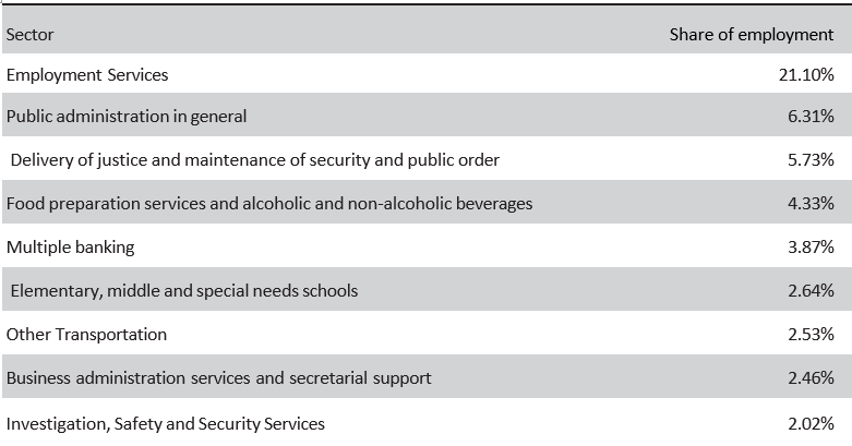 At first glance, the sectors that, when shutting down their operations, have the greatest impact on Mexico City’s GDP are the same ones that cause a more significant negative effect on employment (see Tables 3 and 4). However, the impact tends to vary. Table 6 shows the overall effect on GDP and employment in Mexico City by “removing” the operations of the sectors in the CCI, highlighting the differences in both effects.