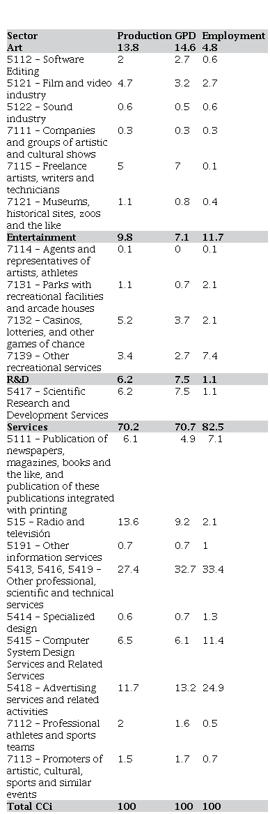 s shown in Table 1, CCIs in Mexico City account for 5% of the city’s GDP and about 6% of employment. Although their share is small compared to other sectors in the city, their importance is still notable because, within other non-creative sectors, their contribution to GDP is similar to that of banking services, and their employment share is comparable to that of the second-largest sector, which is public administration (see Annex1). Creative services are the most significant, contributing over 70% of GDP and more than 80% of employment within the city’s CCIs (see table 2).