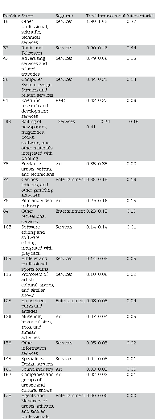 As shown in Table 5, a hypothetical total shutdown of the Other Professional, Scientific, and Technical Services sector would lead to a 2.27% decrease in employment in Mexico City. Of this decline, 1.86% would come from reduced employment within that sector, while 0.42% is linked to declines across other industries. The activities most likely to cause the largest decrease in GDP are Advertising Services and Related Activities (1.56%) and Radio and Television (0.87%). The employment impact from shutting down the Advertising Sector and Related Activities is more concentrated within that sector (1.38%) than on other sectors (0.18%). Interestingly, job losses from the closure of Radio and Television would impact other sectors more (0.75%) than the sector itself (0.12%). Overall, shutting down most sectors of the CCI has a low impact on employment in Mexico City. This is shown by the fact that only 6 out of 20 sectors rank within the top 75 positions based on the impact of total closure across the 184 sectors in the Mexico Input-Output Matrix. Similarly, it’s notable that of these six CCIs in the top 75, the first five are in the services segment, while the remaining one belongs to the entertainment segment.