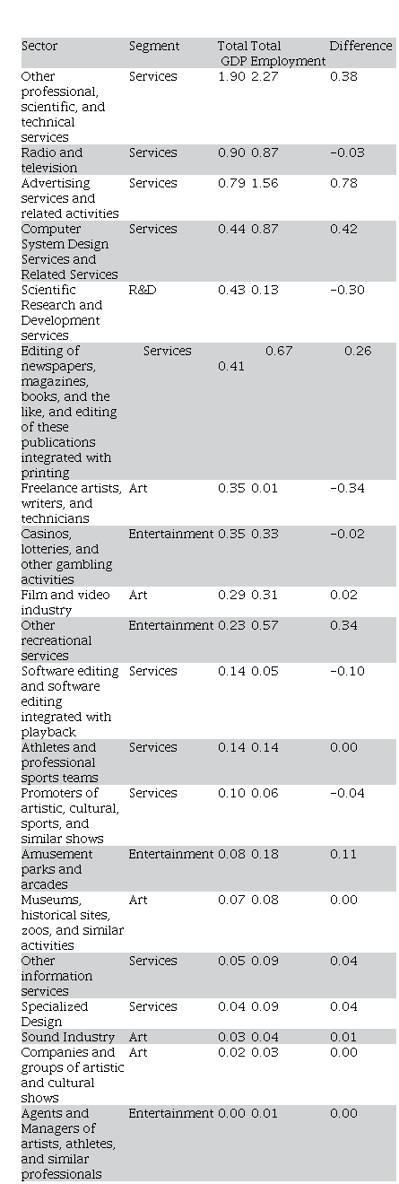 While sectors that have a greater impact on employment than on GDP include Advertising Services and related activities, with a difference of 0.78%, Computer Systems Design Services and related services, with a difference of 0.42%, Other Professional, Scientific, and Technical Services at 0.38%, and Other Recreational Services at 0.34%. Examining the differences among CCI sectors based on their influence on GDP and employment is crucial because it helps us predict whether internal or external shocks, like the recent Covid-19 crisis, might cause more losses in value added or employment. This information is valuable for developing contingency plans for the impacts of future crises, whatever they may be.