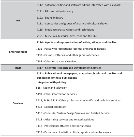 The application of input-output analysis to assess CCIs before the pandemic showed a wide range of evidence regarding their effects. Boix-Domènech et al., (2018) suggests that, for the European Union, their impacts range from 2.6% to 7.8% on production and employment. In the Czech Republic, Šlehoferová (2014) estimated that the average consumption multiplier was only 0.473, much lower than the construction sector’s multiplier of approximately 0.908. However, its primary impact was on the product multiplier, which averaged 1.9, with advertising services being the most important sector within the creative industries. Lyons (2023) conducted a regional analysis of Wales’s 2018 national output-input matrix for the Cardiff urban area, examining nine sub-sectors of creative industries that contribute 3% of value added and 2.6% of local employment. Through changes in final demand, Lyons (2023) modeled the impacts of the nine creative sub-sectors on the economy; his results show that the sectors most affected by Covid were those requiring face-to-face interaction, such as music, visual and performing arts, and design. Sukma et al. (2018) applied the same product and found that in Indonesia, fashion exports increased national value added by 0.06% and employment by 0.11%. Additionally, artisanal exports increased national value added by 0.05% and employment by 0.11%, showing that their main effects are in creating jobs. Zuhdi et al. (2013) use Japan’s 2005 input-output tables to analyze the impact of CCIs divided into seven sectors. Their results show that the rise in exports and consumption of goods from CCIs boosts the Japanese economy, while the increase in imports of these goods has a negative effect. Heng et al. (2003) used input-pipeline analysis to identify the multipliers of the creative sectors in Singapore, showing that by 2000, CCIs contributed 3.2% of GDP and 2.2% of employment in the country. When measuring their indirect effects, they estimated impact multipliers of 1.8 for output and 0.8 for value added, both higher than those estimated for the United Kingdom, which has one of the most developed CCIs. An intriguing finding is that CCIs are strongly connected to construction and education, which receive 10% of their inputs from creative sectors. In Australia, the Creative Industries Innovation Centre (2013) studied seven creative sectors and used a national input-output matrix, showing that the total impact multiplier of creative and cultural industries (CCIs) is 3.76, with advertising, marketing, and architecture having the largest multiplier effects on the economy. In 2019, the Creative UK Group (2021) estimated that CCIs had a total impact of 10.7% on employment and 9% on gross value added, based on input-output matrices. Its direct impact made up 6.4% of employment and 5.9% of the UK’s gross value added. The estimated multipliers for France, Germany, and the UK range from 1.7 to 1.9, according to a study by Deloitte (2021). In contrast, research on productive linkages and the impacts of CCIs in Mexico is nearly nonexistent, apart from one study by Valdivia et al. (2022). These researchers use the input-output method to calculate the backward and forward multipliers of CCIs in Mexico City, based on a 2008 state matrix. Their main results show that CCIs generally have low impact multipliers; however, certain key activities in the services and software sectors display significant forward multipliers, along with the creative services sector, newspaper publishing, and especially advertising agencies. An important aspect of all the input-output impact analyses reviewed above was identifying the sectors that make up the CCIs, since the official tables do not specify this type of activity. As a result, there is considerable diversity in the kinds and number of sectors used, which makes the results largely incomparable across different studies on the subject. In our case, it was also necessary to adapt the existing methodologies for identifying sectors within CCIs. To this end, we adopt the proposal of Valdivia et al. (2020), which suggests a broader classification of the creative sectors by incorporating R&D to revive innovation processes. This classification aligns more closely with the Orange Economy classifications developed for Latin America, as shown in Table 1 and Table 2.