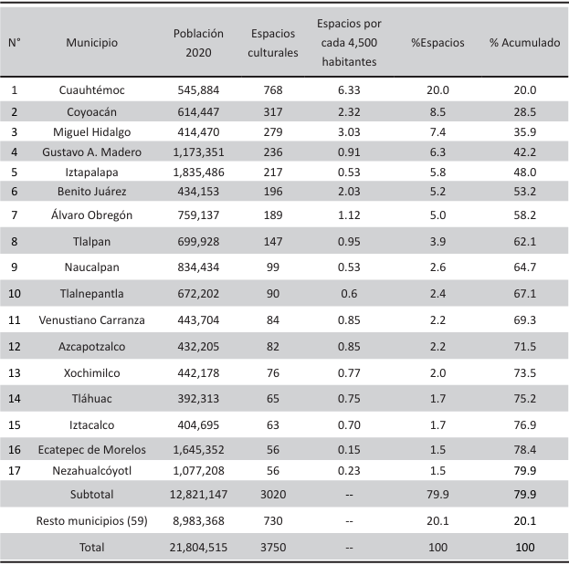Con arreglo a la idea 80-20 de Pareto, al contabilizar la cantidad de espacios culturales por demarcación, se encuentra que en solo diecisiete de ellas, que representan el 23.6 %, están ubicados el 80 % del total de espacios culturales de la ZMVM. Es decir, de los 3,750 lugares disponibles en toda la zona, 3,020 se ubican en esas alcaldías/municipios. Este elevado grado de concentración se explica, entre otros elementos, por un largo proceso histórico de urbanización. En aquellos espacios con mayor antigüedad de asentamientos humanos, es natural que existan más de esos espacios, con mayor valor histórico, pero además con mejores condiciones de accesibilidad y aforos, (véase tabla 2).