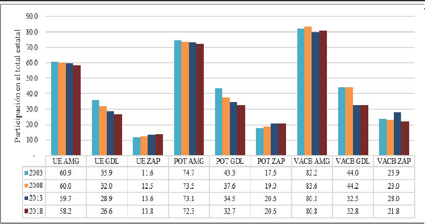 La concentración de actividades, empleo y generación de valor agregado en Guadalajara y Zapopan conservó la centralidad del AMG, como punto focal de atracción poblacional, con economías de aglomeración y urbanización a partir de la infraestructura física y social, que proporcionó una oferta sostenida de empleo para hacer frente a la demanda de sus habitantes y sus inmigrantes, observable en la participación económica que mantuvieron respecto al total del AMG y del Estado entre 2003 y 2018 (figura 1), a pesar de las políticas de regionalización de 1995 y 2015, que buscaron amortiguar la desigualdad en el Estado.