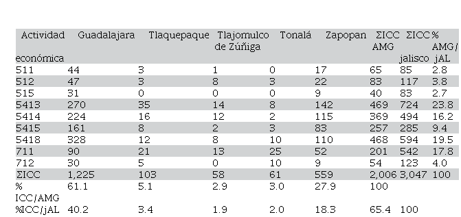 Respecto a la aglomeración de ICC persistente en la metrópoli, se aprecia que los subsectores y ramas del sector 54 son los preponderantes (figura 6). Esta concentración abarca 65.4% del total de las empresas estimadas de las ICC de Jalisco, cuya distribución presenta un patrón claramente desigual y bipolar a nivel municipal: Guadalajara centraliza 61.1% del total metropolitano; mientras que Zapopan alberga 27.9%, San Pedro Tlaquepaque 5.1%, Tonalá 3.0% y Tlajomulco de Zúñiga 2.9% del total del área.