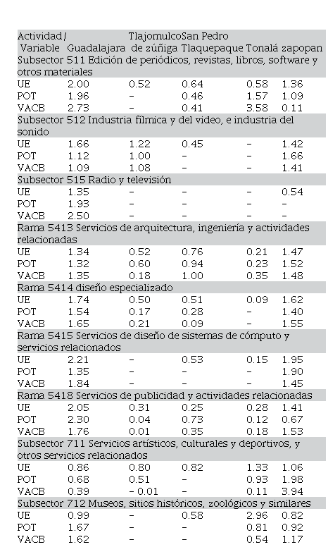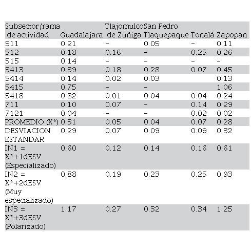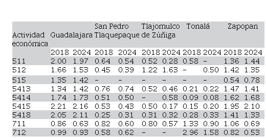 El índice de especialización explica la preponderancia del municipio de Guadalajara en la localización de las ICC, pues salvo en el subsector 711 Servicios artísticos, culturales y deportivos y en 7121 Museos, sitios históricos, zoológicos y similares, en los cuales no presenta un coeficiente mayor a uno en cuanto a las unidades económicas, en el resto de las actividades económicas tiene una especialización en los tres indicadores considerados.