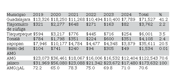 La política estatal favorable al desarrollo de las ICC se reflejó en la implementación de cincuenta programas con apoyos financieros a través de la SC entre 2019 y 2024, que sumaron un total de $173.66 mdp para toda la entidad y que nuevamente refleja su alta concentración en el AMG con un 70.58% del total y en lo particular en los municipios de Guadalajara y Zapopan, en un 41.19% y un 20.51%, respectivamente.