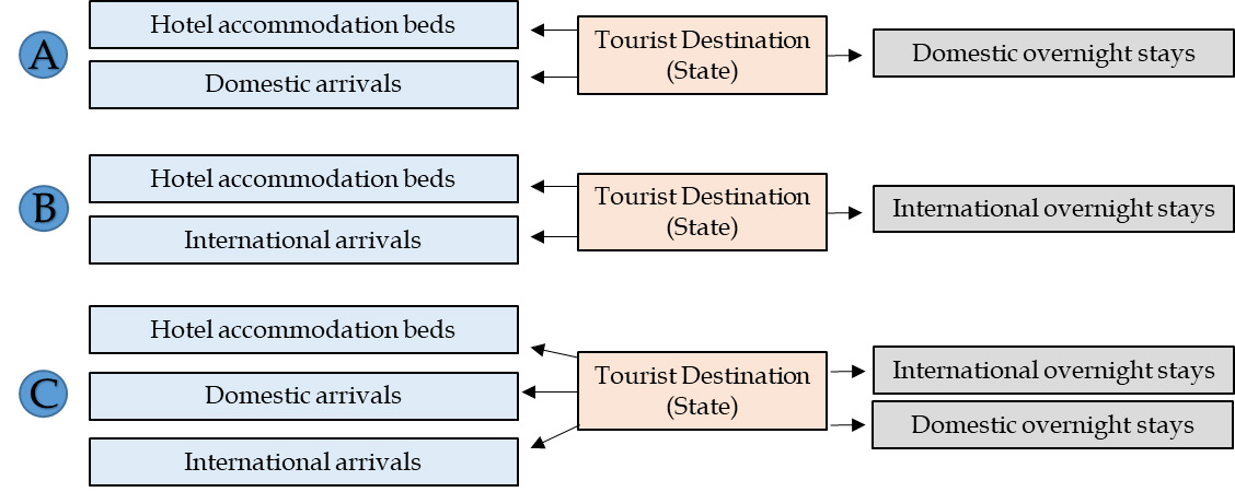 Figure 1 shows the schematic of the three production function models used in this study as well as the variables considered in each. In model A, we analyze efficiency in maximizing the tourism impact of national or domestic tourists. For this, we use domestic tourist arrivals and hotel accommodation capacity as inputs, while on the output side we include the number of overnight stays by domestic tourists. In model B, we evaluate efficiency for the flow of international tourism, making the subsequent adjustments in the production function, both in the arrivals and overnight stays corresponding to this flow. Finally –and as the main contribution of our work– model C combines the two flows. In reference studies, it is common to see how individualized approximations are proposed for national or international flows but which, however, include –in the production function–resources that cannot be individualized in the same way.