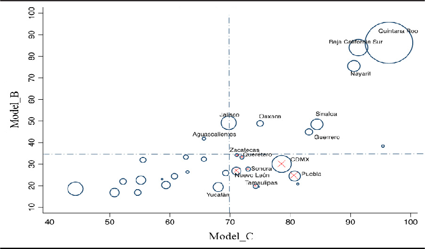 At the upper end of the top right quadrant are the “super destinations” (Quintana Roo, Baja California Sur, and Nayarit) of foreigners, which, in addition, increase their efficiency in model C due to the complementarity of national tourism. Particularly worthy of note in this quadrant is the state of Oaxaca since, unlike the other states, it is predominantly a cultural destination and not a sun and beach destination. Although it does not have a significant flow of foreign tourists, its efficiency levels place it as an appropriate destination for promoting diversification in foreign destinations. In particular, the states located in the lower right quadrant are of interest because, despite not specializing in foreign tourism (since they are below the average efficiency in model B), they do increase their efficiency strongly under model C. This is not only because of their specialization in domestic tourism but also because of the complementarity that foreign tourism provides. CDMX, Puebla and, to a lesser extent, Nuevo León, undoubtedly become favorable destinations for promoting the deconcentration of foreign tourism, added to which they are all cultural.