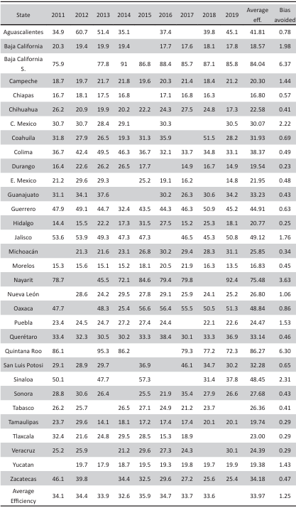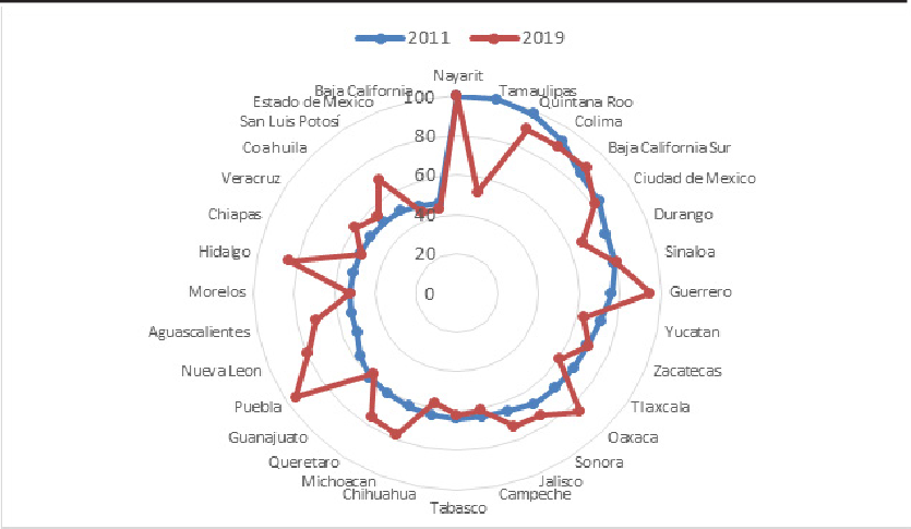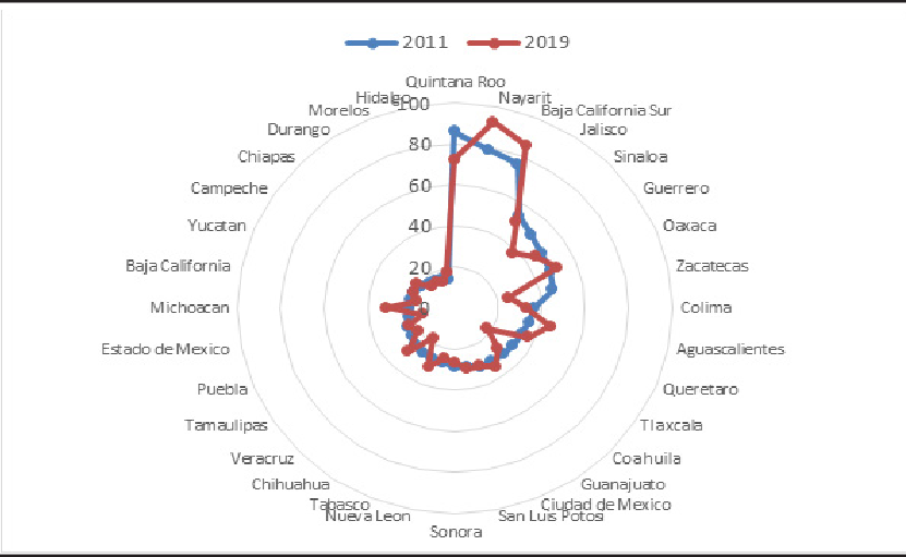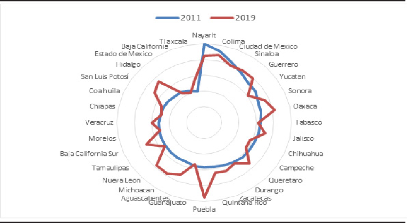 Figures 3 to 5 describe in a radial format how efficiency evolved for each model in the years 2011 and 2019. Figure 3 shows the results for model A. It can be seen that most destinations improve their results, with Puebla and Oaxaca being particularly significant. Few destinations reduce their efficiency –such as Nayarit, Colima– and even Mexico City, probably due to congestion effects. Most units exceed 40% efficiency, both at the beginning and at the end of the period.