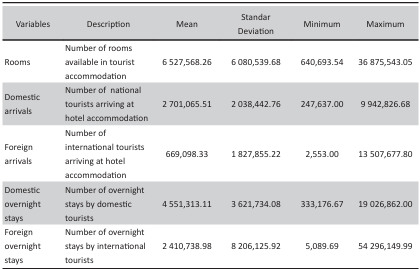 The sample is made up of the 32 Mexican states, based on information provided by DATATUR4 for the period 2011 to 2019. Table 1 shows the study variables and their main descriptive statistics. In order to make the estimates more robust, a balanced panel of data was constructed consisting of 288 observations (32 states and nine years), on which the efficiency analysis is applied.