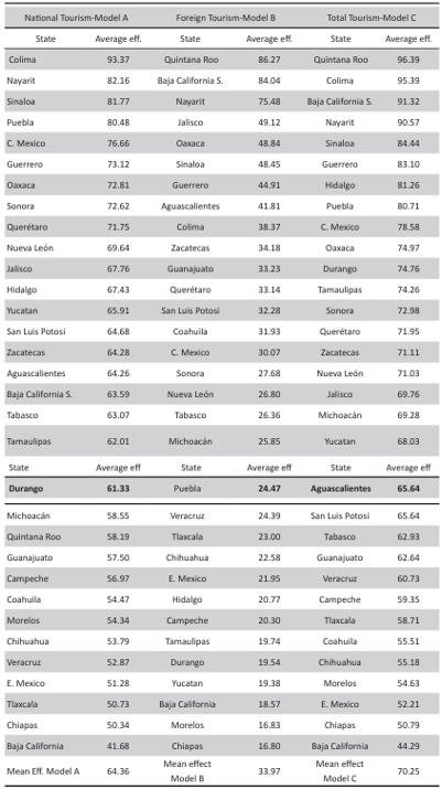 When analyzing the specific effects of national tourism, nine states are seen to be above 70% efficiency. Most of these are located on the Pacific coast and in the interior of the country, where destinations such as Colima, Nayarit, Sinaloa, Puebla, and Mexico City stand out. In general, the most efficient destinations are states with beach endowments that are less congested by international tourism, in addition to states with important cultural resources in terms of magical towns, cities declared World Heritage Sites by UNESCO, and museum infrastructures, such as Puebla, Mexico City, Querétaro, and Oaxaca. However, in the case of the international tourism model, we find that only three states exceed an average efficiency of 70%: Quintana Roo, Baja Cali- fornia, and Nayarit. All of them could be characterized as sun and beach destinations because they are home to important tourist centers such as Cancun (Quintana Roo), Los Cabos (Baja California Sur), and Riviera Nayarita (Nayarit). This tells us about the type of tourism demanded by international tourists in Mexico, where they also stay for long periods of time, thereby maximizing the economic impact. However, they have an insignificant effect on the rest of the states, which they either do not visit or only stay in for a very short time.