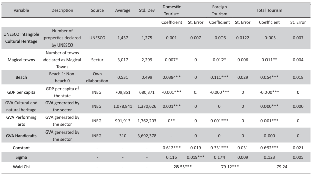 Likewise, the variable beach is added as a structural factor of competitiveness, in view of the centrality of the sun-and-sand model in shaping Mexican tourism, included as a dichotomous variable. GDP per capita is incorporated as a proxy for the general level of economic development of the state, which allows for an analysis of whether there is a relation- ship between economic prosperity and tourism efficiency. Similarly, three indicators of gross value added (GVA) in sectors directly linked to cultural and tourism activity are considered: cultural and natural heritage, performing arts, and handicrafts, with the aim of evaluating the role of cultural industries in relative efficiency. Taken together, this selection seeks to test the hypothesis that both cultural resources and the economic context influence the capacity of the states to maximize their tourism efficiency.