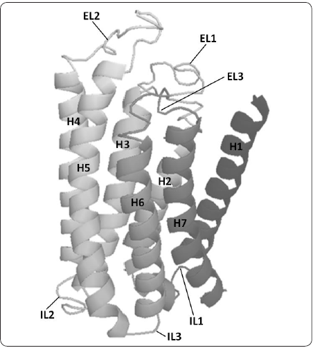 Three-dimensional structural model of Ste2p. A ribbon representation of the three-dimensional structure of Ste2p is presented. Ste2p has a central core made of seven transmembrane helices (HI to H7) connected by three intracellular (IL1, IL2 and IL3) and three extracellular loops (EL1, EL2 and EL3). This model shows the counterclockwise orientation of transmembrane helices used for modeling GPCRs. The image was generated with PyMol.