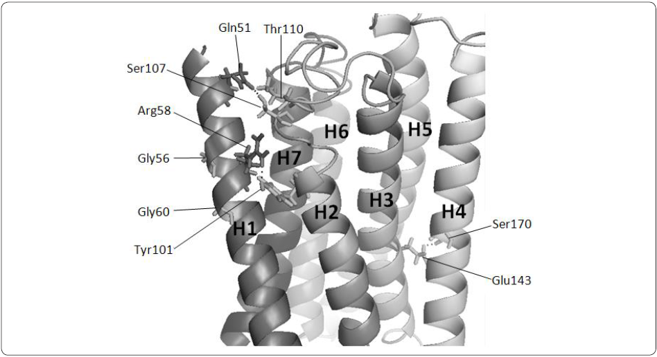 Residues involved in helix-helix interactions in Ste2p model. The transmembrane helices of Ste2p are presented as ribbons and are enumerated from H1 to H7. For convenience, transmembrane helices are displayed in a clockwise orientation. Hydrogen bonds are formed between Arg58-Tyr101, Ser170-Glu143, and Ser107-Gln51-Thr110, and are displayed with dots. Gly56 and Gly60 are oriented outwards the protein. The image was generated with PyMol.