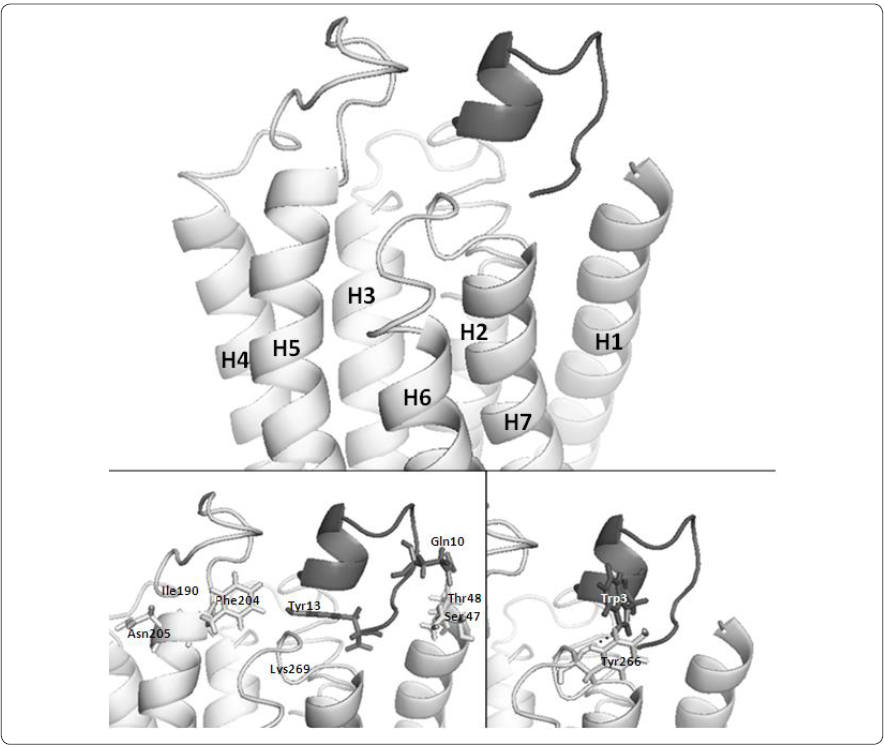 The docking simulation aimed to model the Ste2p-alpha pheromone interaction (Figure 4). In this model all contacts in the Ste2p-alpha pheromone interaction previously reported are present. For instance, previous studies about the affinities and activities of various alpha pheromone analogues have shown that residues Ser47 and Thr48 are near Gln10 in the alpha pheromone17. As we see in Figure 4, our binding model is congruent with these data. Phe204 and Tyr266 are located in the extracellular ends of the helices H5 and H6, respectively. These helices are linked at the opposite end involved in pheromone binding by the third intracellular loop that interacts with the trimeric G protein and promotes its activation14,46,48. Site-directed mutagenesis studies showed that Phe204 interacts with the C-terminal region of the pheromone (likely with Tyr13), while Tyr266 interacts with the N-terminal region (likely with Trp1 or Trp3)18. Both residues, Phe204 and Tyr266, play roles in the transformation of Ste2p into an activated state upon agonist binding18,47. As shown in Figure 4 our model is consistent with these experimental data despite the previously noted differences in our model about H6 and the intracellular ends of H2 and H3 (residues Asn84 and Gln149). Finally, interaction between aromatic residues in the alpha pheromone and Ste2p could be stabilized by ring stacking effects or by hydrogen bonding. In our model the interaction between Tyr266 and Trp3 is stabilized by hydrogen bonding (Figure 4).