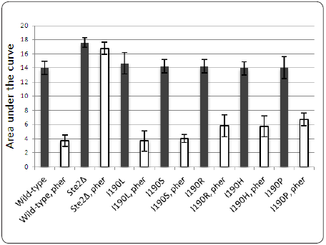 Area under the growth curve for each mutant strain. The population growth of yeast strains expressing any of five mutants at Ile190 (I190L, I190S, I190R, I190H and I190P) is represented by the Area Under the growth curve (Y axis) both in the presence and absence of the alpha pheromone (indicated by the abbreviation “pher” in the figure). As control, the growth of wild type strain (BY4741) and a strain carrying a deletion of STE2 gene are presented.
