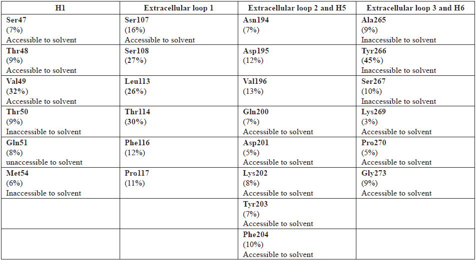 Composition of the interface between Ste2 and alpha pheromone. Interface residues were defined as those residues in Ste2p that were no more than 5 Å apart from the pheromone. Solvent accessibility data were obtained from Lin, J.C., et al., 200453. Percentage of conservation (indicated in parenthesis for each residue; this percentage represents the fraction of 214 orthologue sequences that have an identical residue to Ste2p at that position) was derived from the multiple sequence alignment for all the Ste2p orthologues reported for PFAM family PF02116. Those positions with the largest percentage of sequence identity conservation are marked in bold.