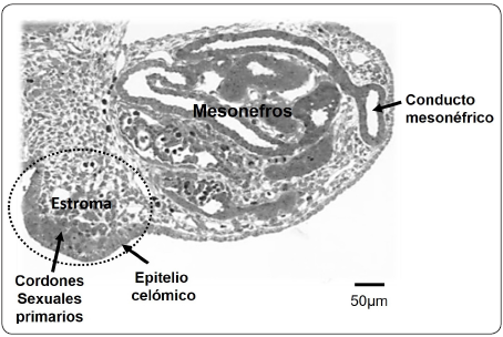 Después de la fertilización, continúan los procesos de segmentación, gastrulación y organogénesis. En el caso de los humanos, hacia la quinta semana de gestación se inicia la formación de la cresta gonadal. En embriones de mamífero, el proceso se debe a la proliferación del epitelio celómico en la región ventral del mesonefros (riñón primitivo). La pequeña cresta gonadal está formada por los cordones sexuales primarios derivados del epitelio celómico y el estroma constituido por la invasión de vasos sanguíneos y células mesenquimatosas procedentes de la región mesonéfrica adyacente (Figura 1). Al aumentar de tamaño, la segregación entre el tejido epitelial formado por los cordones sexuales y el tejido estromático es más evidente y alcanza la etapa de gónada morfológicamente indiferenciada o bipotencial, términos que se refieren a la imposibilidad de distinguir el sexo gonadal histológicamente y a que dicho primordio embrionario contiene elementos celulares con capacidad de diferenciarse en células ováricas y testiculares. Además de las células somáticas de los cordones sexuales y el tejido estromático, la cresta genital es colonizada por las células germinales primordiales provenientes del epiblasto (Figura 2A), proceso que ocurre entre la quinta y novena semana de gestación en el humano2 .