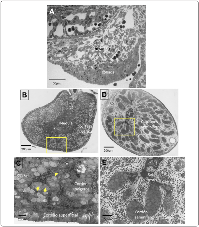 Desarrollo morfológico de las gónadas de conejo. A) Corte transversal de una cresta gonadal morfológicamente indiferenciada. B) Diferenciación morfológica del ovario, se observa la región medular y la corteza ovárica engrosada, en el recuadro amarillo se muestra la amplificación del corte mostrado en el panel C) las flechas señalan ovocitos que han iniciado la meiosis. D) Diferenciación morfológica del testículo fetal, en la región medular se observa la segregación de los cordones seminíferos, en el recuadro amarillo se muestra la amplificación de los cordones seminíferos junto con la rete testis (E).
