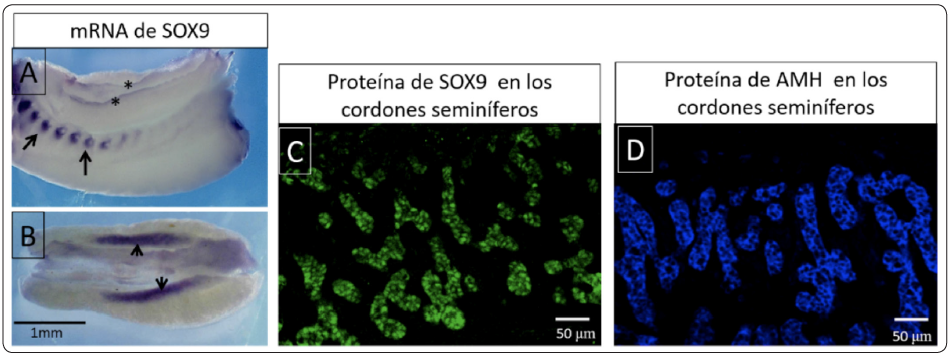 El gen Sry (Sex Determining Region of the Y Chromosome) codifica para un factor de trascripción del mismo nombre que se caracteriza por unirse a secuencias de ADN blanco y modificar la expresión génica. La expresión del gen Sry en las células precursoras de Sertoli de los cordones seminíferos en la gónada humana inicia entre los días 41 y 44 post-ovulación8. Pocas horas después, las mismas células expresan al gen Sox9 (Sex determining región Y-box9)9 A diferencia del gen Sry, es un gen autosómico ubicado en el cromosoma 17 en humanos y su expresión es requerida en otros eventos del desarrollo embrionario por ejemplo en la condrogénesis. En la Figura 3A-B se muestran fotografías de hibridación in situ donde se detectaron los transcritos de Sox9 en muestras de conejo. Su expresión se observa tanto en las costillas como en las crestas genitales, evidenciándose su expresión pleiotrópica.