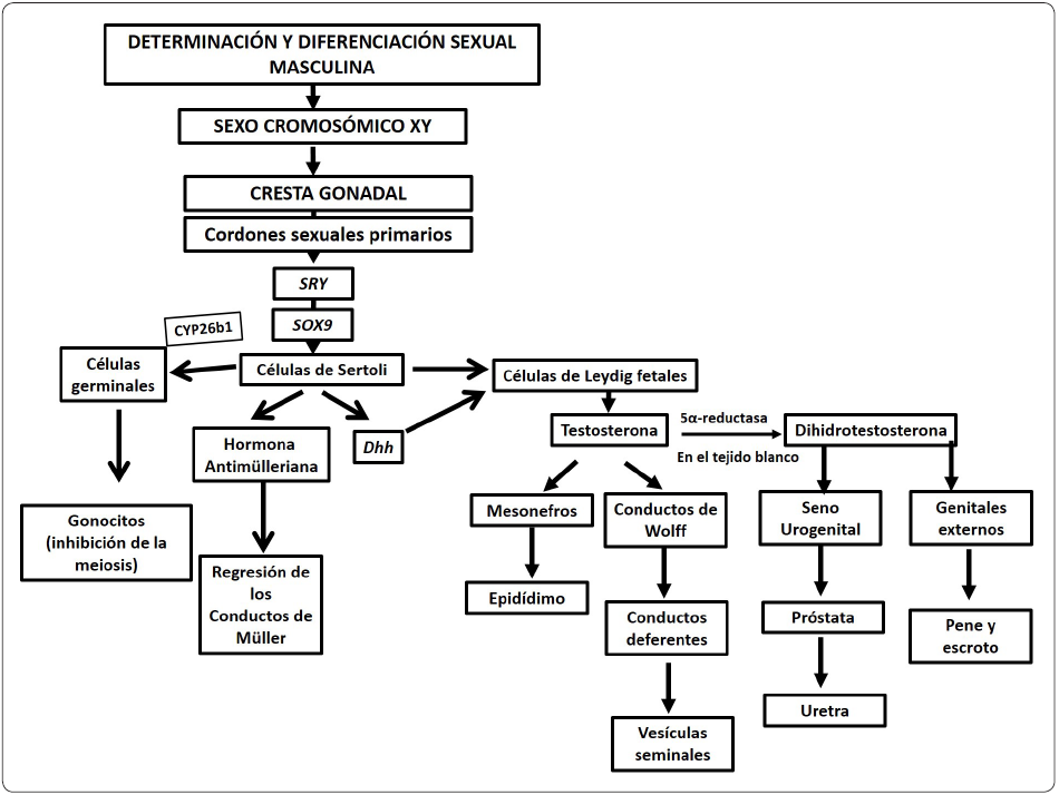 Diagrama de flujo del establecimiento del sexo masculino. En el diagrama de flujo se resumen los eventos moleculares que llevan a la masculinización fenotípica en mamíferos. En individuos con una dotación cromosómica XY la diferenciación de la cresta gonadal hacia el testículo es inducida por la expresión de los genes Sry y Sox9. La diferenciación fenotípica masculina depende de un mecanismo hormonal. Las células de Sertoli producen a la hormona antimülleriana encargada de la regresión de los conductos müllerianos. En tanto que las células de Leydig fetales producen testosterona encargada de masculinizar el tracto. La diferenciación del seno urogenital y los genitales externos requieren de la conversión de testosterona en dihidrotestosterona (DHT). Las células germinales primordiales comienzan un proceso de arresto mitótico e inhibición del inicio de la meiosis que las mantiene latentes, como gonocito hasta la pubertad, cuando se reinicia el proceso de espermatogénesis.