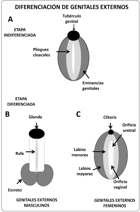 Esquema de diferenciación de los genitales externos. A. Fase indiferenciada de los genitales externos, aproximadamente a las 4 semanas de gestación en humano. B. Desarrollo de los genitales externos en el varón, al nacimiento. El tubérculo genital crece y origina el falo, los pliegues cloacales se fusionan para dar origen a la uretra, las eminencias genitales se fusionan y originan el escroto. C. Formación de los genitales externos femeninos. El tubérculo genital aparenta una reducción de tamaño y da origen al clítoris. Los pliegues cloacales crecen para originar los labios menores, mientras que las eminencias genitales forman los labios mayores.