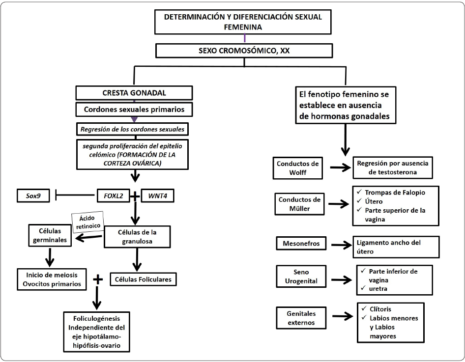 Diagrama de flujo de la determinación y diferenciación sexual femenina. En individuos XX, la conversión de la cresta gonadal a ovario requiere de la expresión de genes que inhiban la expresión de Sox9. Entre los más notables se encuentran Foxl2, Wnt4 y Rspo1. El establecimiento del fenotipo femenino no requiere de la producción hormonal ovárica, ya que incluso en ausencia de una gónada se desarrolla un fenotipo femenino. Sin embargo, no se establecen los caracteres sexuales secundarios por la ausencia de los esteroides sexuales. La regresión de los conductos de Wolff se debe a la ausencia de testosterona, mientras que la ausencia de la hormona antimülleriana permite la diferenciación de las trompas de Falopio, el útero y la porción superior de la vagina.