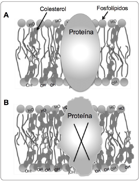 El aumento de colesterol en la membrana altera su estructura. (A) El colesterol se encuentra anclado estratégicamente en las membranas de la célula, donde modula la fluidez y permeabilidad. La molécula de colesterol constituye el elemento estructural básico del esqueleto de las membranas celulares, sin su refuerzo las membranas serían extremadamente fluidas y perderían su consistencia. (B) El aumento de los niveles de colesterol en la membrana afecta la organización y sus propiedades físicas, lo que disminuye la fluidez y aumenta la rigidez. En consecuencia, estos eventos afectan negativamente a ciertas proteínas transmembranales, las cuales requieren libertad conformacional para realizar sus funciones de manera apropiada. Basado en 21,112.