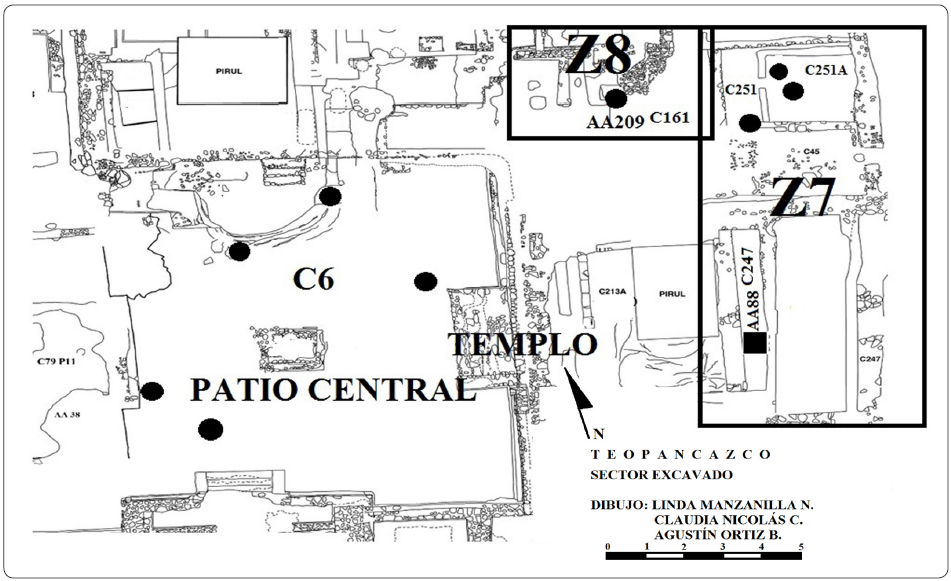 Ubicación de los restos de quelas de cangrejo, croquis en planta de Teopancazco. Los puntos en negro indican el lugar donde fueron recuperados los restos de cangrejo rojo y en el cuadro el lugar donde se encontró la quela de cangrejo azul (Croquis proporcionado en los seminarios permanentes de Teopancazco por Manzanilla [3], modificada por Rodríguez[2] y Padró[1]).