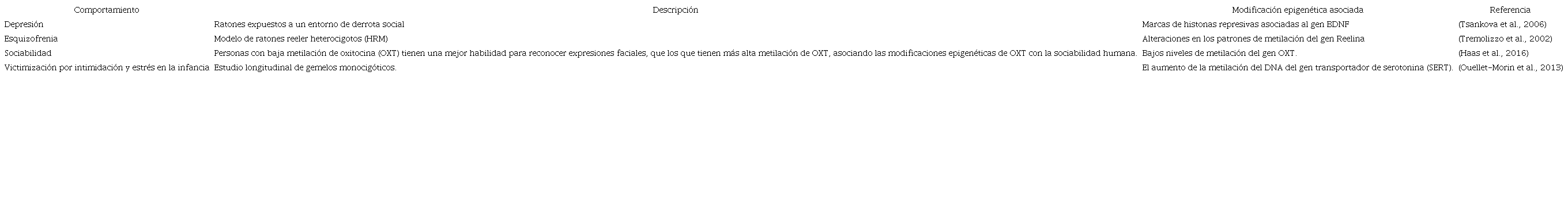 La compactación de la cromatina puede ser promovida o inhibida por modificaciones epigenéticas que son inducidas por diferentes factores biológicos y ambientales. Además, las modificaciones epigenéticas podrían influir en la personalidad y habilidades de los individuos (Tabla I). La epigenética (epi, del griego, que significa en/sobre), hace alusión a los cambios heredables en la expresión de los genes que no están asociados a la secuencia del DNA, sino a la conformación de la cromatina. Cada organismo tiene un epigenoma particular y a su vez cada grupo celular tiene su propio epigenoma que hace posible la activación y represión de genes específicos. Los ejemplos más visibles de la epigenética a nivel de un organismo se demuestran en gemelos monocigotos, que comparten la genética y sus rasgos fenotípicos, pero una epigenética distinta con diferentes personalidades, habilidades e incluso enfermedades. Al respecto, se han reportado diferencias en el perfil de metilación del DNA genómico, el patrón de acetilación de histonas y el transcriptoma de gemelos monocigotos durante su etapa adulta (Fraga et al., 2005). Los mecanismos epigenéticos permiten la adaptación al ambiente y son importantes en la salud y en procesos fisiológicos como el envejecimiento, pero también están implicados en el desarrollo de enfermedades, como las neurodegenerativas (Chen et al., 2017; Pal & Tyler, 2016; Yan, Matouk & Marsden, 2010).