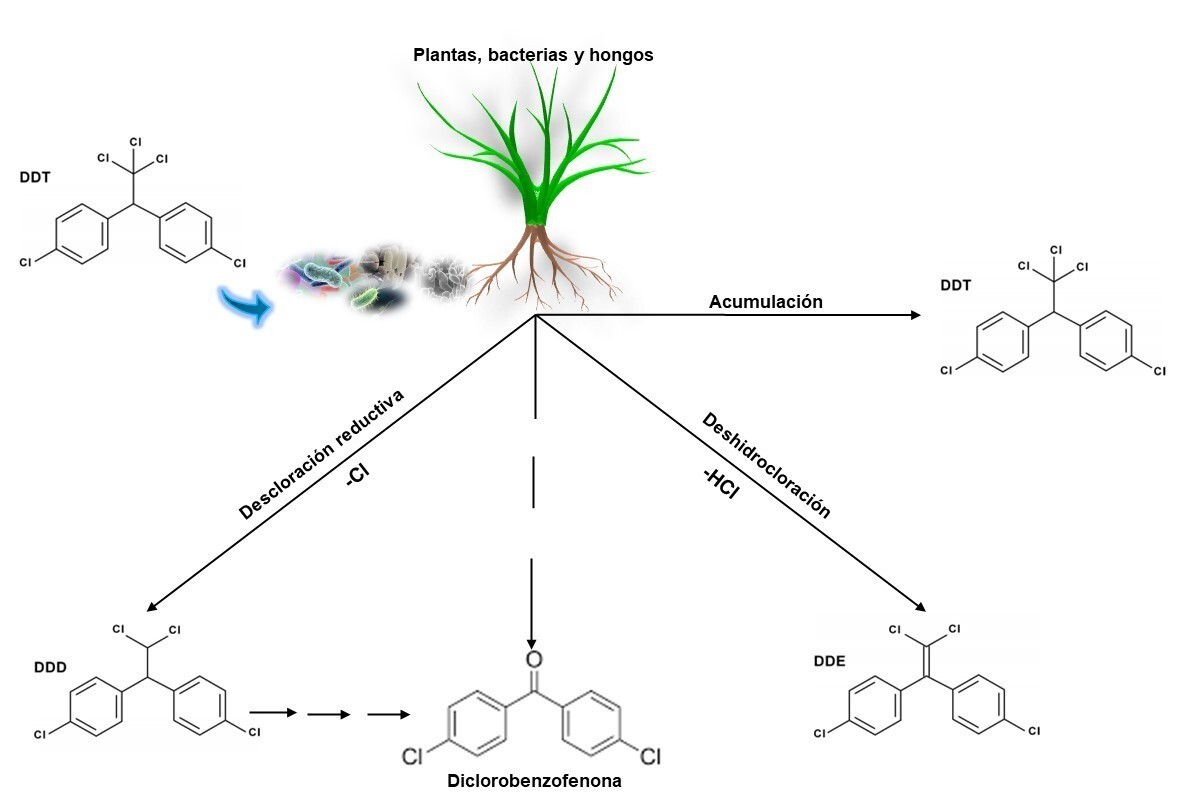 Por sus propiedades fisicoquímicas (Tabla I), el DDT puede ser acumulado y biodegradado en condiciones aerobias y anaerobias. La biodegradación del DDT se lleva a cabo por una serie de enzimas con actividad de oxidasas y monooxigenasas, mientras que en la acumulación participan enzimas con actividad de transferasas y antioxidantes no enzimáticos como el glutatión. Durante la biodegradación del DDT se producen diferentes metabolitos, dependiendo de la ruta de degradación, así en la biodegradación aerobia del DDT hay deshidrocloración y el metabolito que se obtiene es el diclorodifenildicloroetileno (DDE), mientras que en la biodegradación anaerobia hay una descloración reductiva y se obtiene el diclorodifenildicloroetano (DDD) (Figura 1). Muchas de las enzimas de detoxificación y metabolismo de plaguicidas son similares en plantas y microorganismos (Van Eerd, Hoagland & Hall, 2003; Tarla et al., 2020). Se conoce que las plantas tienen la capacidad de acumular y degradar DDT. Estudios realizados con DDT marcado radiactivamente (14C DDT) demuestran que durante el metabolismo del 14C DDT en las plantas se producen los metabolitos DDE y DDD además de acumularse (Menn, Still & Ruhr, 1977; Suresh, Sherkhane, Kale, Eapen & Ravishankar, 2005). Estos procesos de degradación dependen del tipo de planta, condiciones ambientales y tiempo de contacto entre los contaminantes y los organismos.