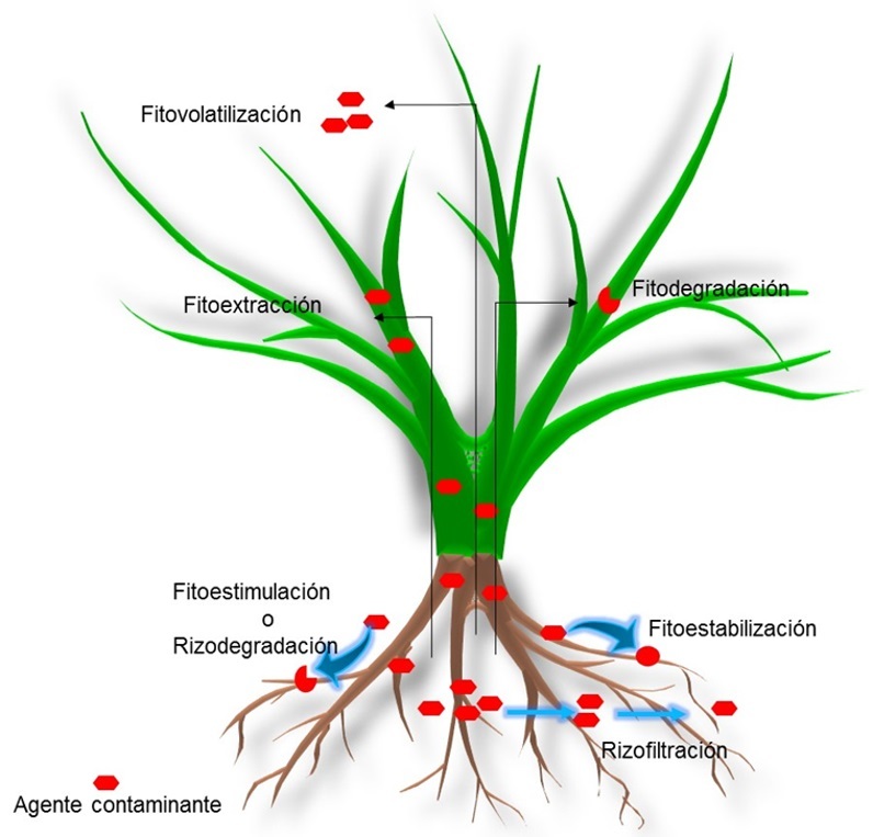 La fitorremediación involucra diversas tecnologías para la descontaminación según el tipo de contaminante en los sistemas y la capacidad de las plantas utilizadas (Figura 2). La rizofiltración se basa en la filtración de los compuestos en cultivos hidropónicos, en los que las plantas actúan como una barrera que previene la contaminación en diversos cuerpos de agua y la lixiviación de los compuestos (Ignatius, Arunbabu, Neethu & Ramasamy, 2014). Las plantas también son utilizadas para extraer los contaminantes y acumularlos en los tejidos aéreos (traslocación) que después se cosechan, lo que se denomina como fitoextracción utilizada para extraer metales y metaloides pesados de suelos y cuerpos de agua, así como compuestos orgánicos de alto peso molecular (Robinson, Anderson & Dickinson, 2015; Sheoran, Sheoran & Poonia, 2016). La fitoestabilización estabiliza contaminantes, principalmente metales y metaloides pesados del suelo en el área de la rizosfera, lo que puede prevenir su lixiviación o disminuir su biodisponibilidad (Sylvain et al., 2016; Najeeb, Ahmad, Zia, Malik & Zhou, 2017). Las plantas pueden degradar compuestos orgánicos utilizando sus propias enzimas, y a este proceso se le conoce como fitodegradación (Al-Baldawi, Abdullah, Anuar, Suja & Mushrifah, 2015; He et al., 2017; Chlebek & Hupert-Kocurek, 2019). En los suelos, la biodegradación de los contaminantes orgánicos se facilita por la actividad microbiana que es estimulada por las plantas, y a esta tecnología se le denomina fitoestimulación o rizodegradación (Glick, 2010; Melo et al., 2017). Una vez que los contaminantes son asimilados por las plantas, éstos pueden ser volatilizados, esto se conoce como fitovolatilización (Wang, Feng, Anderson, Xing & Shang, 2012; Lee, 2013).
