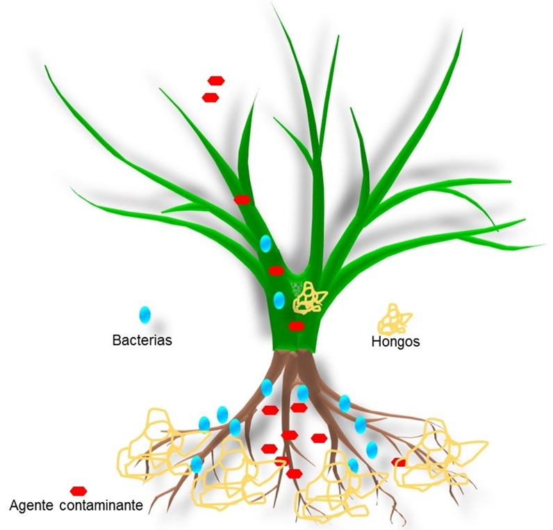 Las tecnologías de la fitorremediación se pueden mejorar mediante la inoculación de microorganismos, lo que ha dado auge a la fitorremediación asistida (Figura 3). Estos estudios incluyen microorganismos endófitos, bacterias promotoras del crecimiento vegetal, hongos micorrízicos arbusculares, hongos filamentosos y hongos septados oscuros (Ullah, Heng, Munis, Fahad & Yang, 2015). Existen diferentes vías para mejorar la fitorremediación, relacionadas con el mejoramiento de la nutrición vegetal, disminución en el estrés oxidativo en las plantas, así como la remoción y degradación de los contaminantes del suelo (Kong & Glick, 2017). Los microorganismos pueden mejorar la fitorremediación gracias a que cuentan con las herramientas que les permiten solubilizar nutrientes que son aprovechados por las plantas, también cuentan con un sistema enzimático que les ayuda a controlar las especies reactivas de oxígeno que generan estrés en las plantas, además de contar con las enzimas involucradas en la remoción y degradación de los contaminantes. El éxito en la fitorremediación asistida por microorganismos está relacionada con la especie de planta y microorganismos que se utilizan.