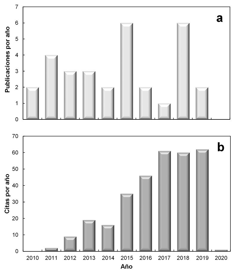 La fitorremediación de suelos contaminados con compuestos orgánicos ha sido en su mayoría ampliamente estudiada, en la remoción de hidrocarburos y con alta efectividad. Los estudios sobre la fitorremediación de suelos contaminados con compuestos organoclorados como el DDT han tenido gran variabilidad en los últimos 10 años, alcanzando hasta seis publicaciones por año en 2018 (Figura 4a). De acuerdo con la Web of Science, los artículos de fitorremediación de suelos contaminados con DDT tienen un promedio de 10.03 citas por artículo, y las citas por año variaron desde ~50 en 2016 hasta ~60 citas en 2019 (Figura 4b). Comparado con otros plaguicidas organoclorados, el DDT es el más estudiado en fitorremediación, por ser como ya se mencionó, de los más persistentes y clandestinamente utilizado. Lo anterior hace referencia a un incremento en la relevancia de este tema de investigación con respecto a la problemática ambiental del DDT.