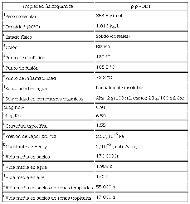 Las propiedades fisicoquímicas del DDT (Tabla I) le permiten ser monitoreado en poblaciones humanas a través del análisis de leche materna, sangre y del tejido adiposo, donde la existencia de DDT en estos componentes indica exposición reciente al compuesto (Arrebola, Fernández, Olea, Ramo & Martin-Olmedo, 2013; Chávez-Almazán et al., 2018; Cupul-Uicab et al., 2020), además, se ha observado que el DDT puede ser transferido de madres a hijos durante el embarazo a través de la placenta y el cordón umbilical, sin que exista una correlación en el contenido entre lo encontrado en la madre y el feto (Vizcaino, Grimalt, Fernández-Somoano & Tardon, 2014).