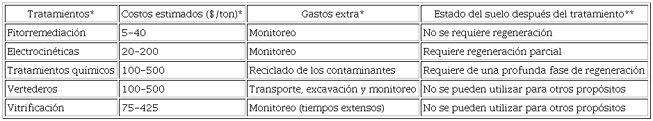 La utilización de cualquier tipo de tecnología para remediar un sitio contaminado requiere de un análisis que considere el tipo de contaminantes, las características del sitio, y las condiciones ambientales, así como el tiempo y costos de recuperación (Chattopadhyay & Chattopadhyay, 2015). La fitorremediación es una de las estrategias más económicas para la recuperación de cualquier sitio; un análisis sobre el costo de la fitorremediación realizado con el software Ingeniería de Acción en Costos y Requisitos para Remediación (RACER, por sus siglas en inglés), mostró que el costo de esta estrategia oscila entre 21.5 y 75.3 dólares/m2, dependiendo del área de contaminación y características del sitio (extensión, accesibilidad al sitio, entre otros) (Chattopadhyay & Chattopadhyay, 2015).