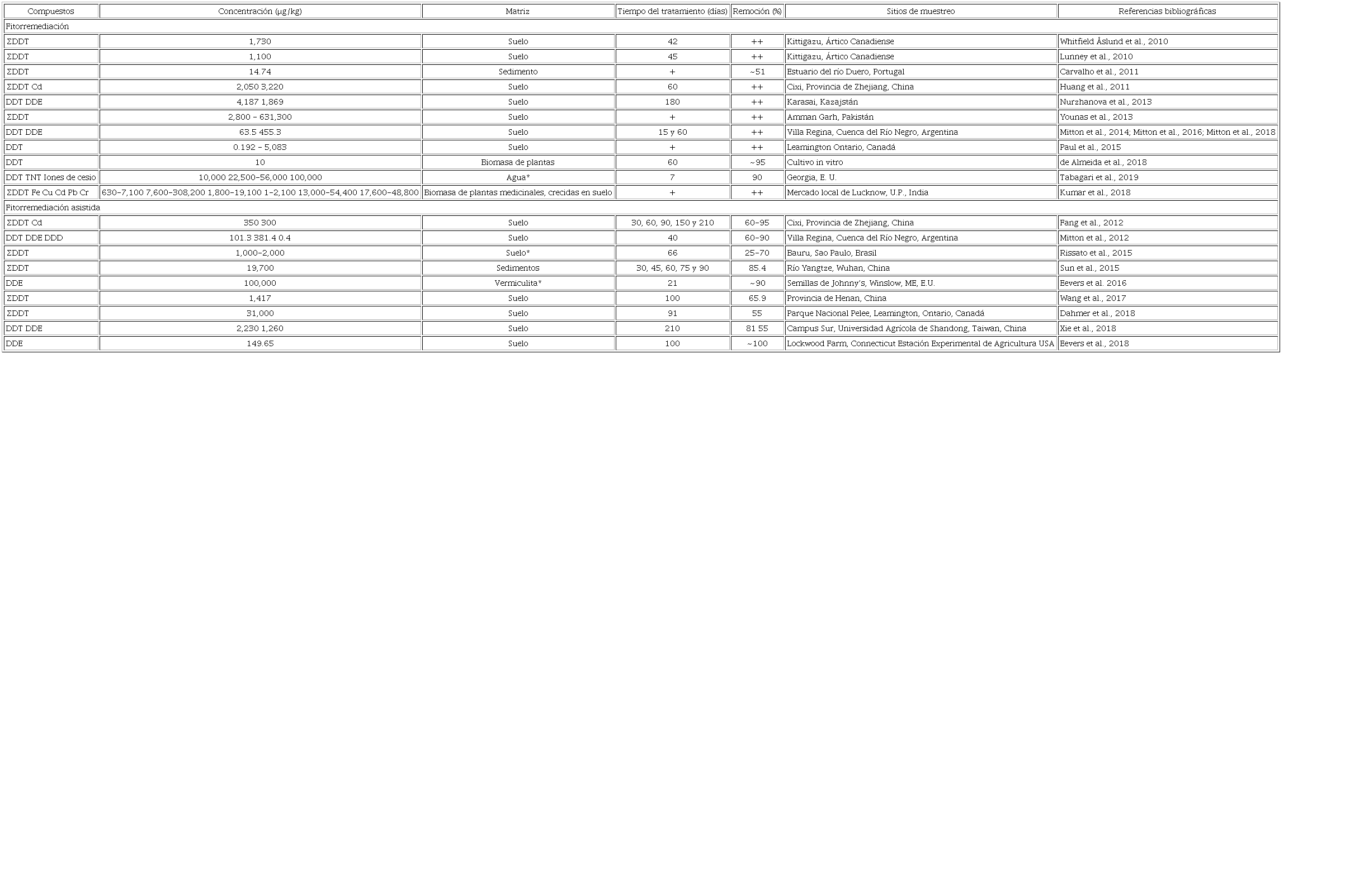 La mayoría de los sitios estudiados, en los documentos científicos revisados, excedieron las concentraciones de DDT permisibles por los sectores que regulan los parámetros del contaminante (Tabla III), lo que indica una alta persistencia de éste y un reciente uso del compuesto. Como se puede observar (Tabla III), en los últimos diez años, en México aún no se consideraba la fitorremediación para la limpieza de los suelos contaminados con DDT, por lo que resulta importante comenzar a incursionar en la investigación sobre el tema y proveer a la comunidad de una estrategia para recuperar los sitios contaminados con este compuesto, que se sigue utilizando, como se mencionó, de manera clandestina.