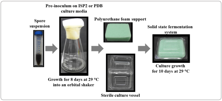 Solid state cultivation with Polyurethane Foam (PUF) was implemented using PDB and ISP2 broth media. A high density PUF support of L × W × H 12 × 10 × 2.5 cm was washed several times with distilled water and sterilized at 121 °C for 15 min. Then, 50 mL of culture media were inoculated with a spore suspension until the DO450 reached 0.1, and deposited into a sterilized plant cell culture vessel (Phytatray™ II L × W × H 11.4 cm × 8.6 cm × 10.2 cm; Sigma-Aldrich). Thereafter, the PUF was added into each vessel with inoculum under strict aseptic conditions, after which the contents were pressed softly by using a sterile Drigalski spatula in order to allow the PUF to fully and evenly absorb them. The contents were then incubated at 29 °C for 10 days (Figure 1) (Zhu, Smits, Knol & Bol, 1994; Wang & Chen, 2016).