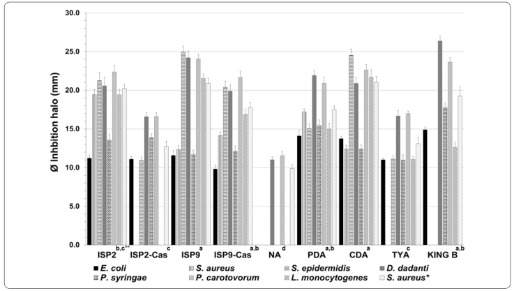 Secondary metabolites production is known to be greatly influenced by ingredients in the media, especially carbon and nitrogen sources. The effect of culture media on bioactive metabolite production was evaluated on the selected isolate Y15. The isolate was inoculated on Petri plates with nine different culture media, and metabolite production was assessed in S. aureus, E. coli, L. monocytogenes, S. epidermidis, Dickeya dadantii, P. syringae, and P. carotovorum, as previously described. The results showed that the Y15 isolate produced inhibitory metabolites against all of the bacterial pathogens when grown under CDA, PDA, ISP2, ISP9, and ISP9-Cas culture media (Figure 3). Metabolites accumulated in TYA media inhibited six pathogens. When Y15 was grown in ISP2-Cas and KA, five species of bacteria were inhibited, except S. aureus and L. monocytogenes in IPS2 and S. aureus and S. epidermidis in KA. An extreme reduction of bioactive metabolites by Y15 was observed when grown on NA media, wherein inhibitory activity was only exerted against D. dadantii and P. carotovorum. In general, a significantly reduction was observed in the inhibitory halo diameter of the pathogenic bacteria, and fewer species of bacteria were inhibited in culture media containing higher concentrations of a nitrogen source (e.g., peptone from casein, beef extract, and yeast extract as nutrient components of KB, ISP2-Cas, TYA, and NA). Otherwise, culture media with limited or absent nitrogen source supplement showed higher inhibitory halo against bacteria species.