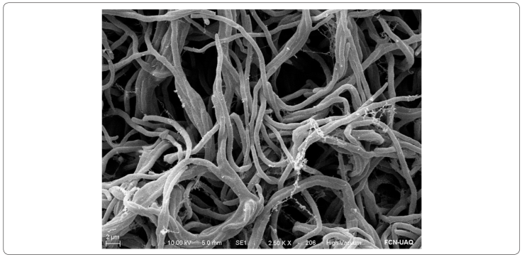 A Petri plate with ISP 2 agar media was streaked with 5 μL of GI and after a 14-day incubation period at 29 °C. An agar block of 14 × 14 mm with an active culture was placed into 2% glutaraldehyde in 0.2 M Phosphate Buffer (PBS, pH 7.2), and left 18 h at 4 °C. Then, the agar pieces were washed in PBS buffer (twice), followed by a 15-min change in 20% ethanol, a 15-min change in 30% ethanol, a 15-min change in 50% ethanol, and a 15-min change in 70% ethanol. The samples were analyzed with an electronic microscope EVO-50 (Carl Zeiss) at the Facultad de Ciencias de la Universidad Autónoma de Querétaro, México.