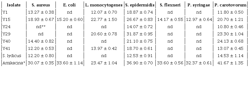 An initial screening to detect antibacterial streptomycetes was essential to select unidentified species. Thirty-one isolates were screened in order to detect inhibitory activity against the bacteria S. aureus, E. coli, L. monocytogenes, S. epidermidis, S. flexneri, P. syringae, and P. carotovorum. Six isolates exhibited clear inhibitory halos surrounding the agar plug-disk from at least two pathogens (Table I). The isolates Y1 and Y41 inhibited four pathogen species (S. aureus, L. monocytogenes, S. epidermidis, and P. carotovorum), while inhibitory halos were detected at all pathogens when agar plug-disk from the isolate Y15 was present (Figure 2).