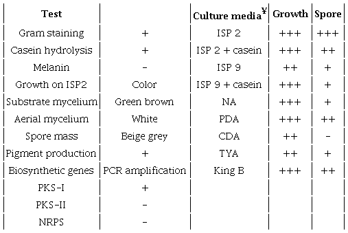 Morphologically, the colonies of the Y15 isolate in ISP2 agar media displayed brown substrate mycelia, white-to-cream aerial mycelia, and spore mass were not evident. This streptomycete has interwoven rope-like hyphae (Figure 5) (Castillo et al., 2005). In addition, some biochemical and physiological features were observed (Table II).