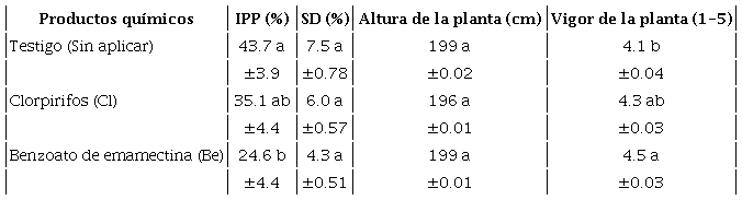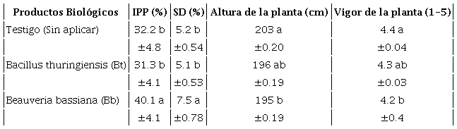 Con base en la ausencia de la interacción antes citada, se realizó un análisis por separado del efecto que los factores de variación tienen en los tratamientos. El Be fue el producto químico de mejor respuesta, con solo 24.6% de incidencia sobre las plantas infestadas y 4.5% de vigor de la planta; la altura de ésta no varió por efecto del tratamiento (Tabla I). El PPI y el vigor de la planta son variables estrechamente ligadas e inversamente proporcionales, o sea que, a un menor porcentaje de plantas infestadas, una mayor proporción de plantas con mejor vigor. Lo anterior coincide con lo reportado por Cherres & Chango (2013), quienes reportaron que al aplicar Larvin 37.5 SC (Thiodicarb 80%) a una dosis de 5 cc, disminuyó 32.5% la PPI y 4.5% la SD. El efecto de los probióticos no fue consistente en el control de la plaga, donde Bt fue significativamente igual al testigo, en tanto que Be superó significativamente a Bt y al testigo, con valores mayores al PPI y SD por S. frugiperda (Tabla II).