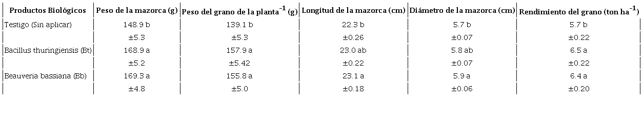 La aplicación de Be incrementó significativamente (P≤ 0.05) el rendimiento del maíz con un valor de 6.8 ton ha-1, correspondiente al 19.3% más que el obtenido en el testigo, sin diferencia estadística al aplicar Be o bien Cl. Este efecto de rendimiento fue producto de una mejor respuesta en el peso del grano por planta, así como de la longitud y el diámetro de la mazorca. El peso de la mazorca no influyó en el efecto del rendimiento, siendo igual que el testigo (Tabla III). En un estudio de evaluación de los productos químicos y los biológicos en el control de S. frugiperda reportado por Muñoz et al. (2017), se encontró un mejor efecto de respuesta en términos del control de la plaga y rendimiento del maíz al aplicar productos químicos, respecto de los productos biológicos, en un estudio realizado en la provincia de Manabí, Cuba; los productos evaluados en ese estudio fueron los biológicos Methankill y Bankill, en tanto que los productos químicos evaluados fueron Lamda Ciametroxina y Tiametoxán.