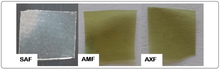 Se formularon películas de alginato de sodio (SAF) delgadas, sin poros, sin fracturas visibles, translúcidas y sin color, con la incorporación de los extractos de A. mexicana mexicana (AM) A. mexicana xolocotziana (AX) (Figura 1), hubo un cambio de coloración a amarillo olivo, conservando su integridad física y al igual que las películas sin extracto presentaron un aspecto homogéneo, translúcido y sin problemas de adhesión al material en el que se elaboraron, por lo que no fue necesario el uso de plastificantes.