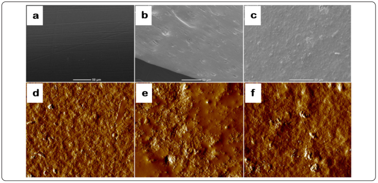 La topografía de la superficie de las películas de 225 µm cada una, se analizó con un Microscopio de Fuerza Atómica (diMultimode V conectado a un microcontrolador di Nanoscope V, Veeco, USA), escaneadas, usando el modo “tapping air” a una velocidad de escaneo de 1 Hz. Para procesar las imágenes se utilizó el software NanoScope Versión 1.5.