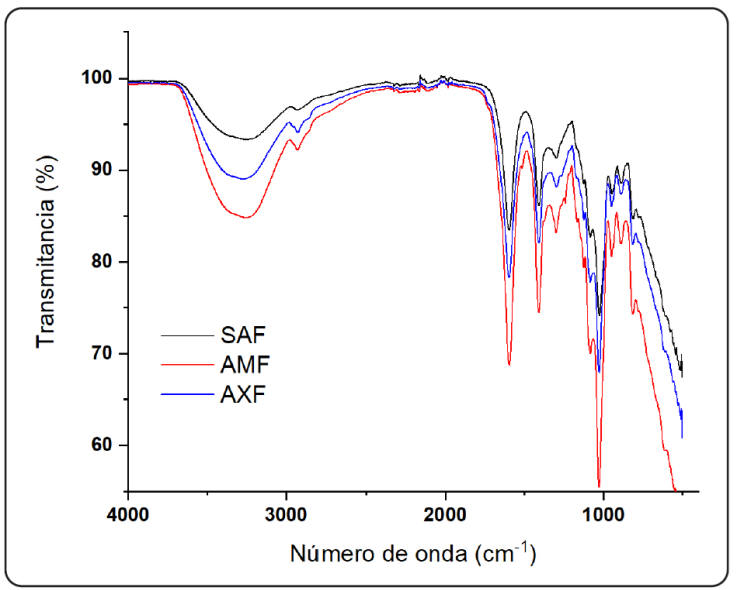 Como un complemento al estudio de la morfología superficial de las películas se empleó la MFA, donde las imágenes topográficas obtenidas (Figura 2d-2f) muestran la presencia de valles (zonas más obscuras) y crestas (zonas más claras). La homogeneidad mencionada se corroboró al ver en las imágenes de MFA de SAF, AMF y AXF una disminución de los parámetros de rugosidad, o sea una rugosidad promedio aritmética (Ra) de 72.8 nm, 21.3 nm y 33.7 nm, respectivamente y rugosidad media cuadrática (Rq) de 93.6 nm, 27.5 nm y 45.1 nm, respectivamente. Otras investigaciones también relacionan la disminución de la rugosidad de las películas y sus óptimas propiedades físicas con la adición de ingredientes activos (Wang et al., 2017).