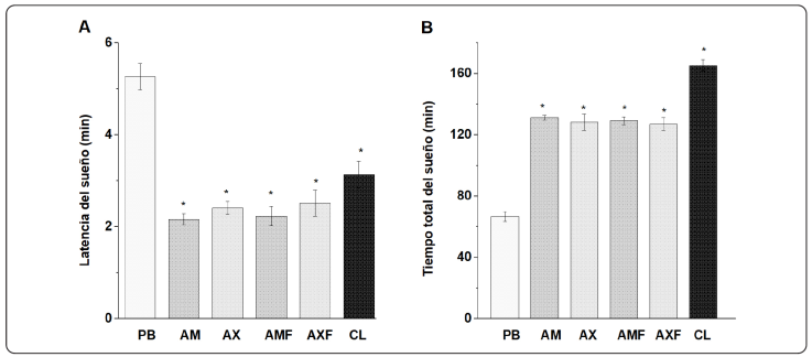De igual manera el tiempo total de sueño de los grupos tratados con AXF y AMF no presentaron diferencia significativa respecto a los extractos AM y AX en medio líquido, con más de 120 minutos de duración del sueño. Estos resultados fueron mayores a lo reportado por González-Trujano et al. (2015) con un extracto metanólico de A. mexicana (40 min.). Este incremento en la duración del tiempo del sueño puede ser atribuida al tipo de extracción (etanólico) que empleamos, ya que se ha reportado que algunos flavonoides presentes en los extractos etanólicos de A. mexicana son efectivos en el tratamiento de trastornos del sistema nervioso central como la ansiedad y el insomnio (Argueta, Cano & Rodarte, 1994; Estrada-Reyes et al., 2014; González-Trujano et al., 2015). Además, existe la evidencia de que algunos flavonoides interaccionan con sistemas de neurotransmisores como la adenosina, la dopamina, la glicina y GABA, este último, el principal neurotransmisor involucrado en la iniciación y mantenimiento del sueño (Johnston, 2015; Park et al., 2020).